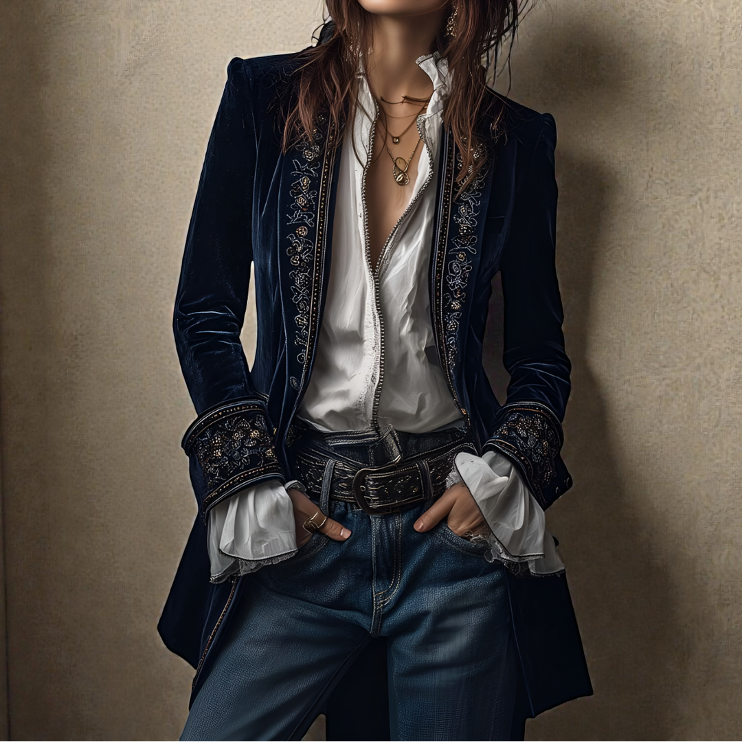 Carita™ - Lange Vintage-Jacke van Marineblauw Fluweel met Borduurwerk